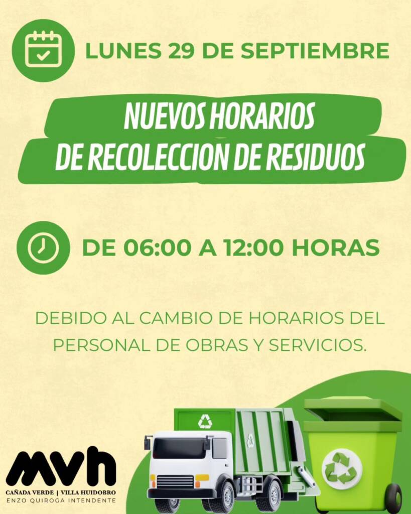 Les informamos que a partir del lunes 29 de septiembre la recolección de residuos se realizará de 06:00 a 12:00 hs.