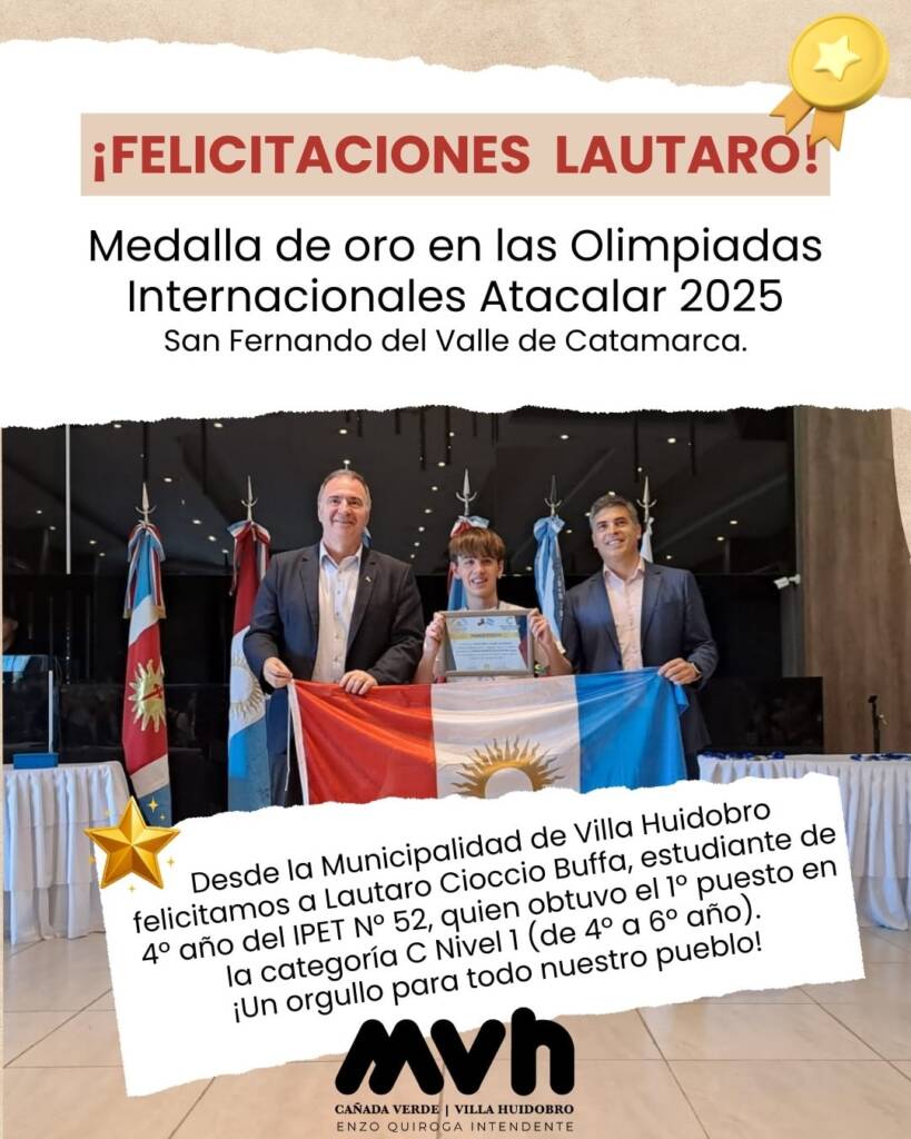 La Municipalidad de Villa Huidobro felicita a Lautaro Cioccio Buffa, estudiante de 4º año del IPET Nº 52, por su destacada participación en las Olimpiadas Internacionales Atacalar 2025, llevadas a cabo en San Fernando del Valle de Catamarca.