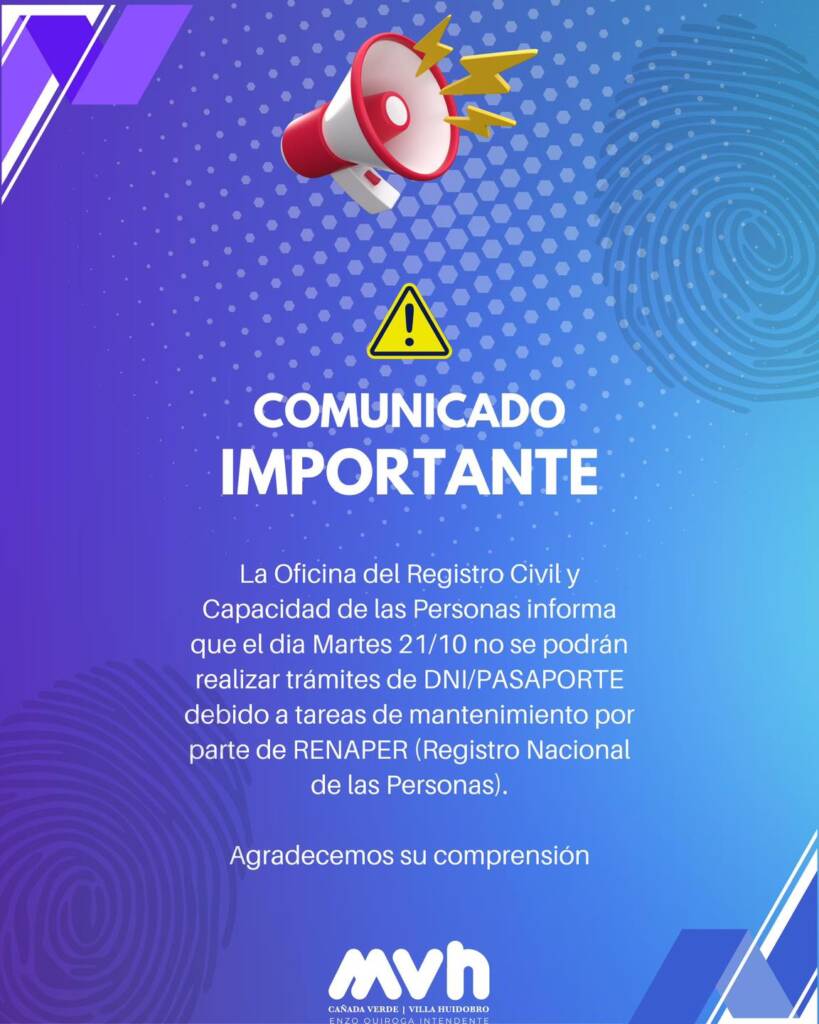 🗣️ La Oficina del Registro Civil y Capacidad de las Personas informa que el martes 21 de octubre no se podrán realizar trámites de DNI o Pasaporte, debido a tareas de mantenimiento por parte del RENAPER (Registro Nacional de las Personas) 🪪