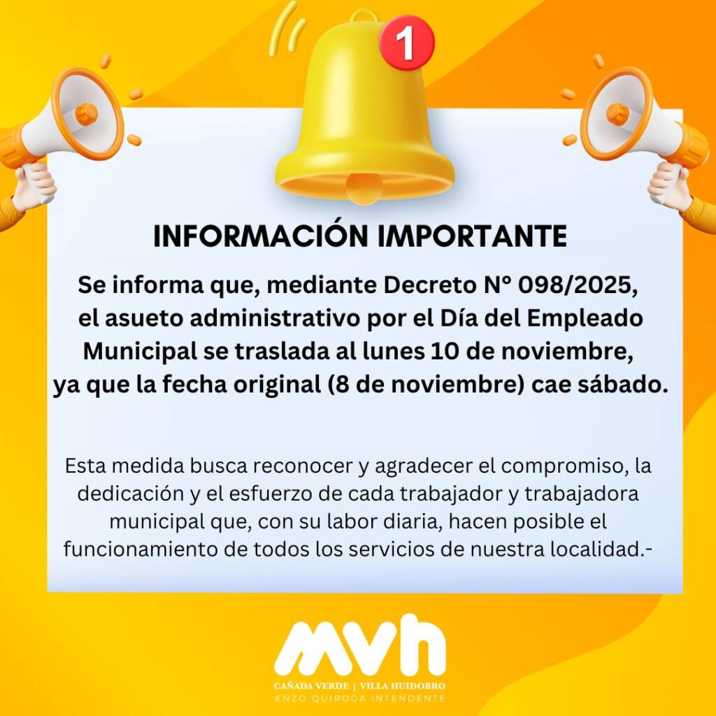 Se informa que, mediante Decreto N° 098/2025, el asueto administrativo por el Día del Empleado Municipal se traslada al lunes 10 de noviembre, ya que la fecha original (8 de noviembre) cae sábado.