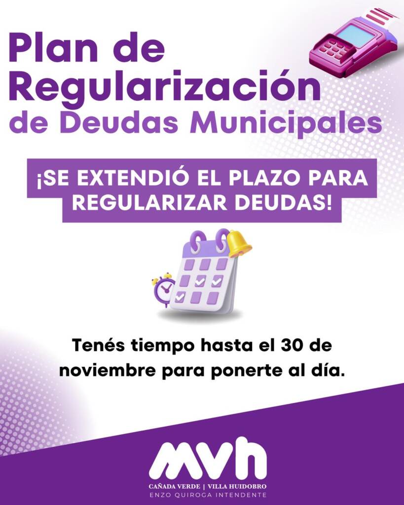 ¡Atención vecinos y vecinas! November 19, 2025 by Yanina Dominguez 0 Se extendió el plazo del Plan de Regularización de Deudas Municipales. Tenés tiempo hasta el 30 de noviembre para ponerte al día con tus impuestos y tasas. Aprovechá esta oportunidad para regularizar tu situación y evitar recargos #GestionEnzoQuiroga #UnGobiernoQueNosUne About Yanina Dominguez