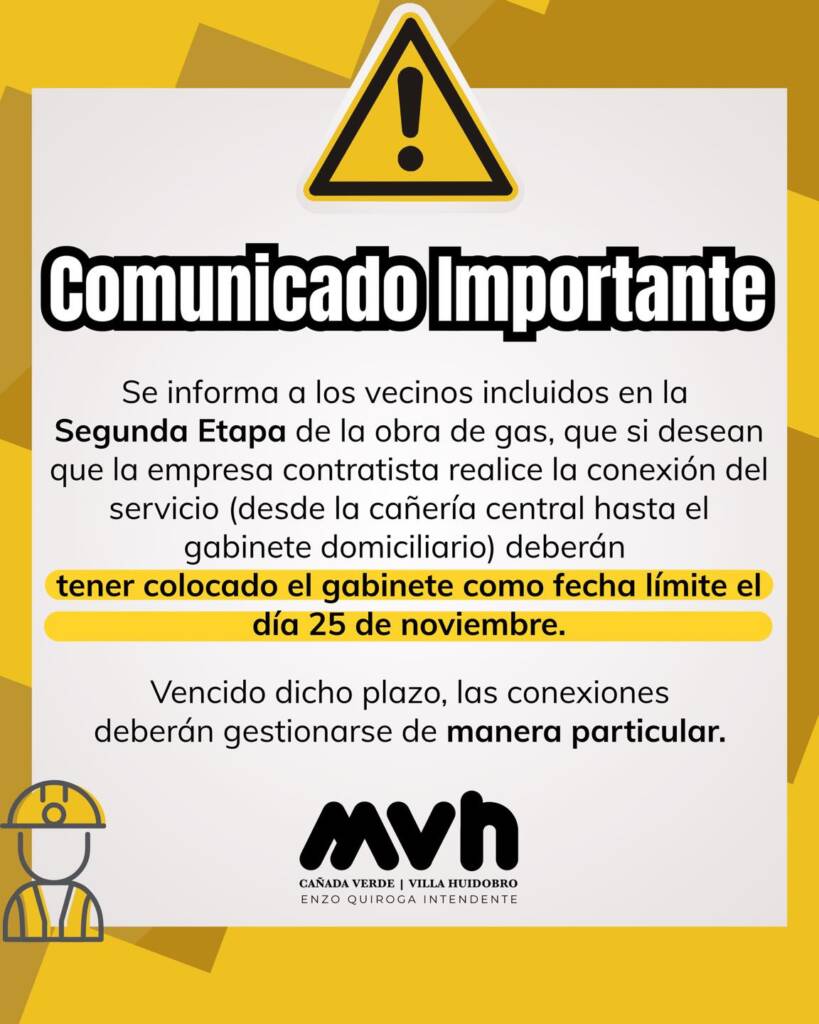 Se informa a los vecinos incluidos en esta etapa que, si desean que la empresa contratista realice la conexión del servicio (desde la cañería central hasta el gabinete domiciliario), deberán tener colocado el gabinete antes del 25 de noviembre.