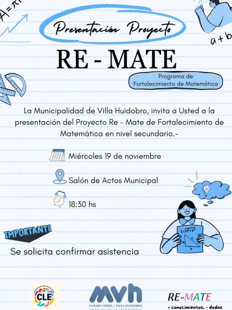 La Municipalidad de Villa Huidobro invita a la comunidad educativa a participar de la presentación del Proyecto RE-MATE, una iniciativa destinada a fortalecer las trayectorias de aprendizaje en Matemática en el nivel secundario.