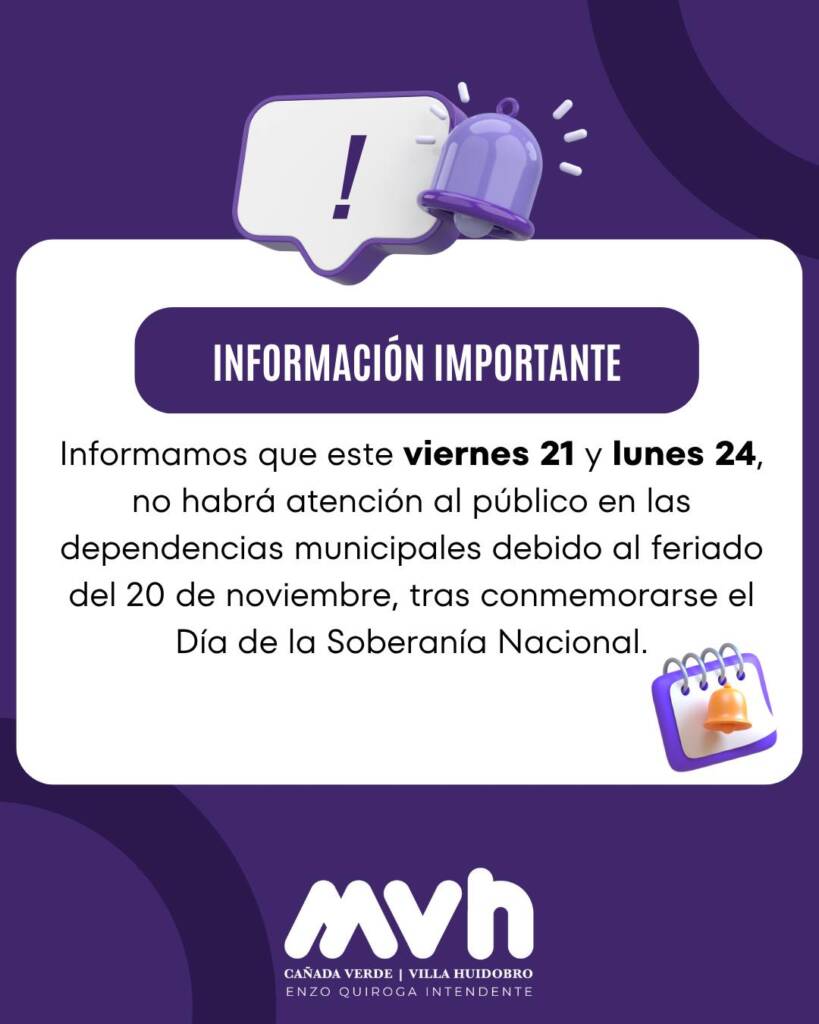 Les informamos que este viernes 21 y lunes 24 las dependencias municipales no atenderán al público debido al feriado nacional del 20 de noviembre, en conmemoración del Día de la Soberanía Nacional.