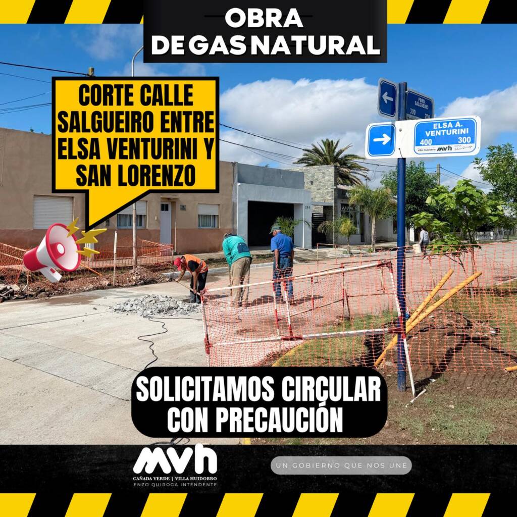 Informamos a los vecinos que la calle Salgueiro permanecerá cortada entre Elsa Venturini y San Lorenzo debido a los trabajos que se están realizando en la obra de gas natural