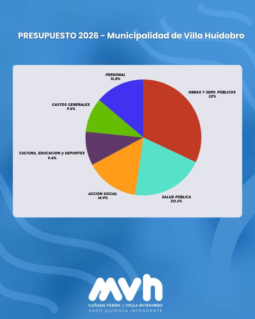 32% destinado a Obras y Servicios Públicos, reafirmando la decisión de seguir transformando Villa Huidobro con infraestructura, conectividad y servicios esenciales.