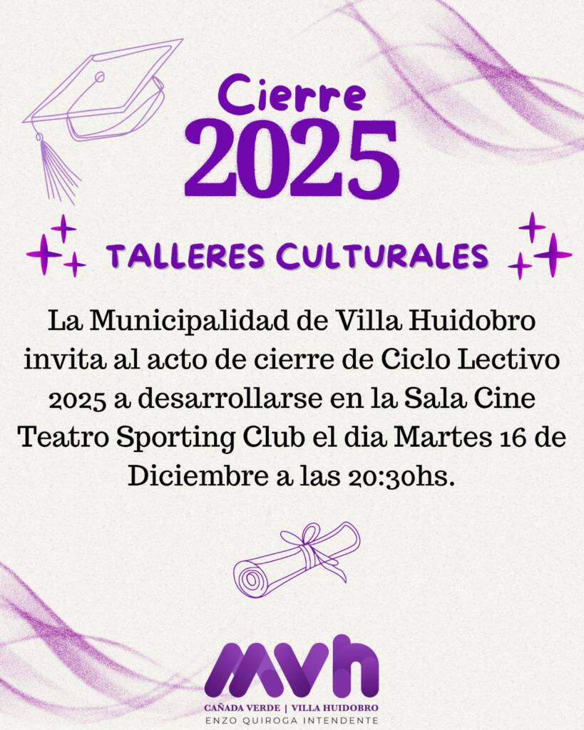 La Municipalidad de Villa Huidobro los invita a participar del acto de cierre del Ciclo 2025 de los Talleres Culturales, que se realizará en la Sala Cine Teatro Sporting Club, el día martes 16 de diciembre a las 20:30 hs