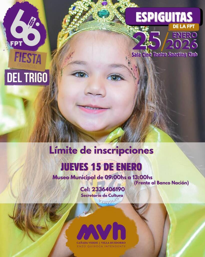 La Municipalidad de Villa Huidobro invita a todas las niñas y niños que cursaron Sala de 5 años durante el año 2025 y estén interesados en participar para ser Espiguitas a inscribirse en el Museo Municipal a partir del día miercoles 7 de enero.-