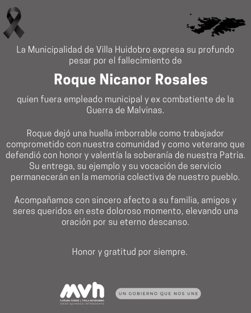 La Municipalidad de Villa Huidobro expresa su más profundo pesar por el fallecimiento de Roque Nicanor Rosales, quien fuera empleado municipal y ex combatiente de la Guerra de Malvinas.