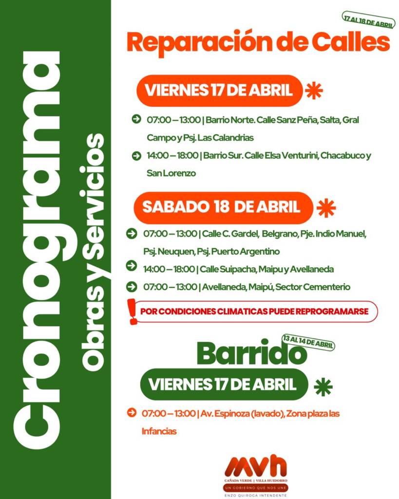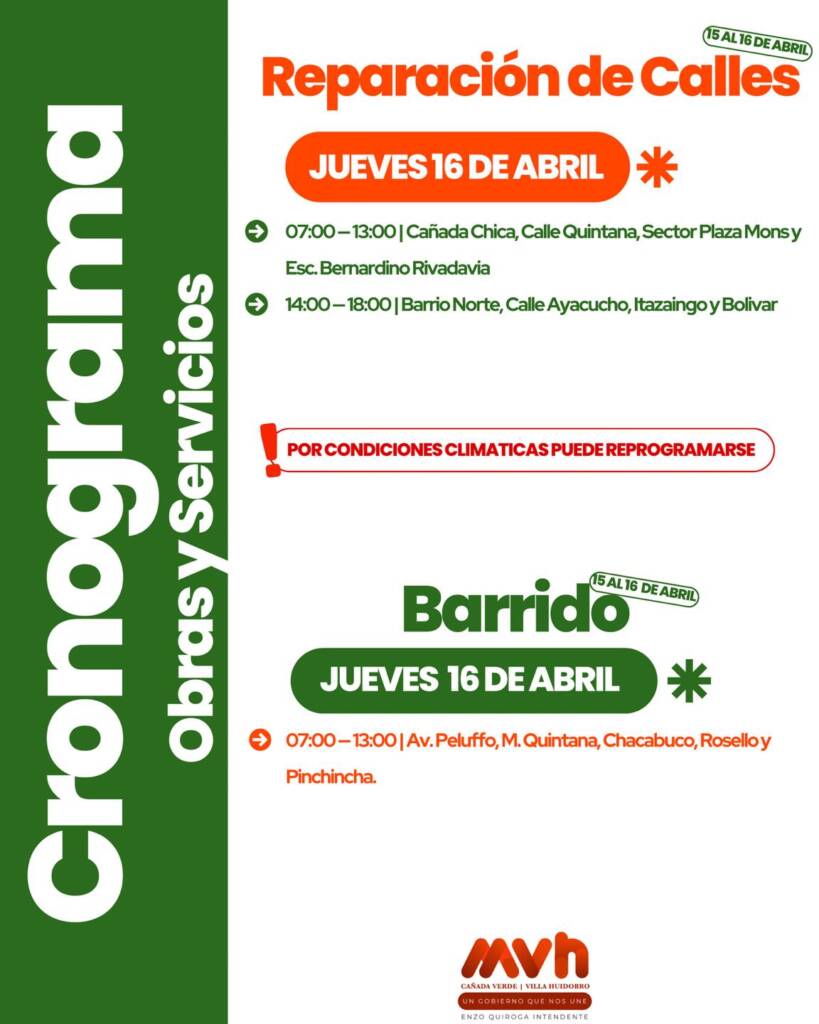 Presentamos el cronograma de Servicios Públicos para la Reparación de calles y Servicio de Barrido, organizado luego de las intensas lluvias registradas para llegar de manera ordenada y eficiente a toda la localidad.