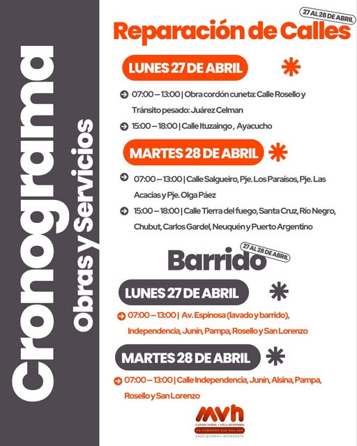 Les compartimos el cronograma de las tareas de Obras y Servicios planificadas para los próximos días