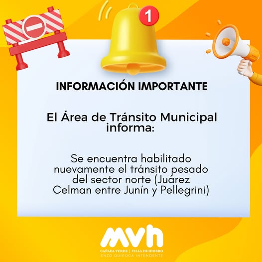 El Área de Tránsito Municipal informa que quedó nuevamente habilitado el tránsito pesado en el sector norte: Calle Juárez Celman, entre Junín y Pellegrini.
